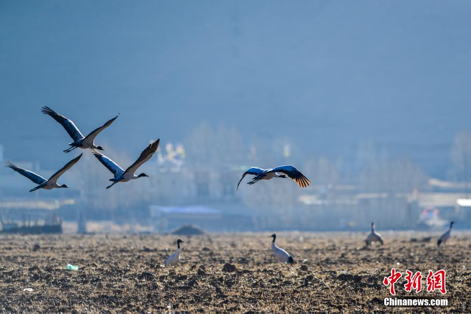 12月30日,西藏拉萨市林周县澎波河谷中的黑颈鹤在农牧民的青稞地里觅食。黑颈鹤系中国国家一级保护动物,藏族民众称为“冲冲”(藏语),被誉为高原吉祥鸟。每年10月至次年4月,成群的黑颈鹤从西藏藏北高原飞至拉萨河谷、林周县澎波河流域等湿地觅食过冬。中新社记者 江飞波 摄