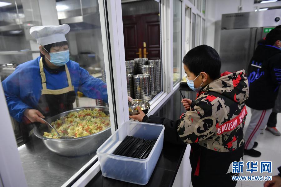 12月31日,学生在北梁红军小学食堂领取早餐。