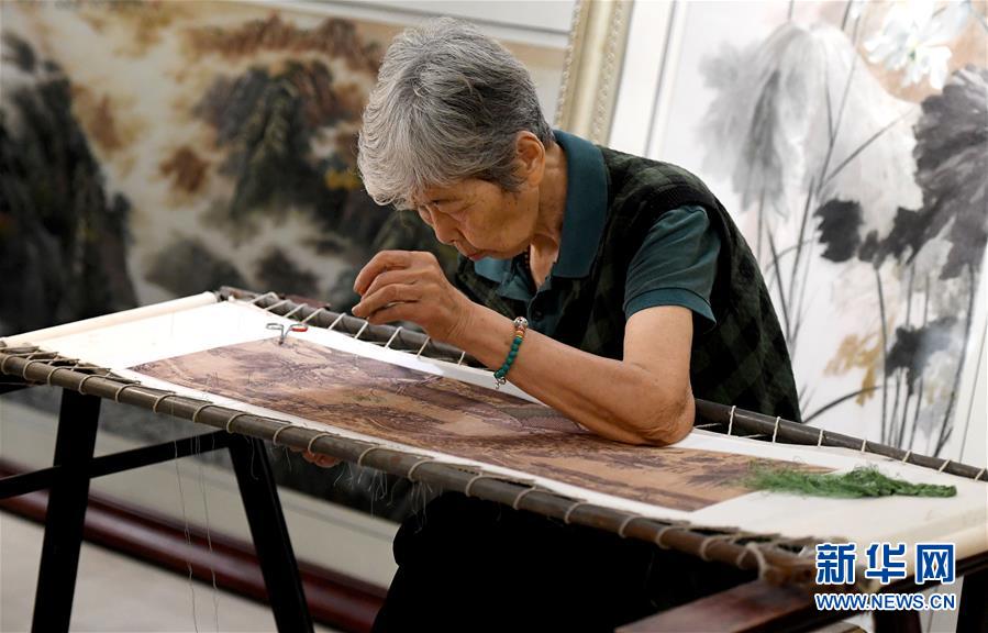 在开封市素花宋绣工艺有限公司的展示馆里,王素花在刺绣(7月30日摄)。 新华社记者李嘉南摄