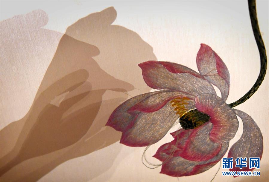 在开封市素花宋绣工艺有限公司的展示馆里,王素花的徒弟刘冬红在刺绣(7月30日摄)。 新华社记者李嘉南摄