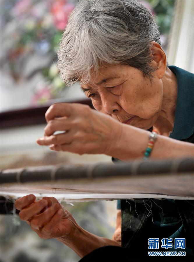 在开封市素花宋绣工艺有限公司的展示馆里,王素花在刺绣(7月30日摄)。 新华社记者李安摄