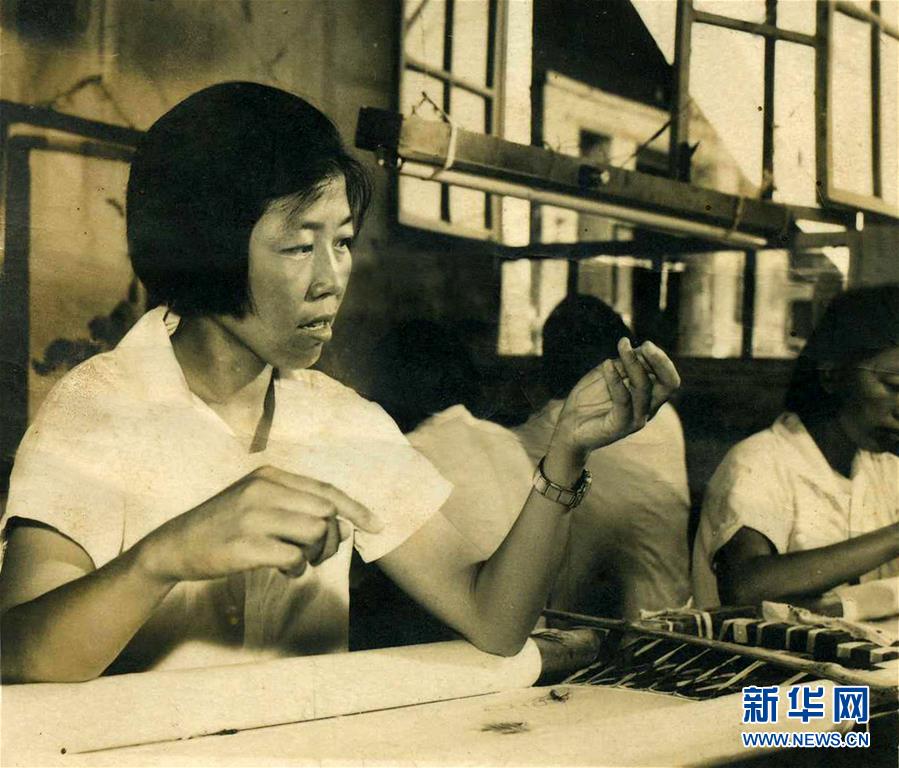 1958年,王素花在开封汴绣厂刺绣(资料照片)。 新华社发
