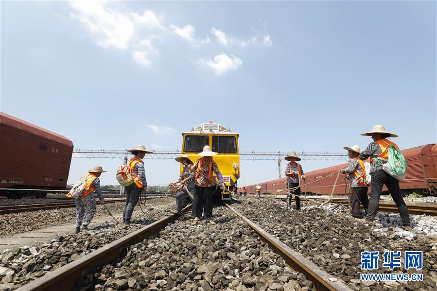 8月4日,鹰潭工务机械段的工作人员在江西鹰潭铁路枢纽编组站施工作业。 新华社记者 胡晨欢 摄