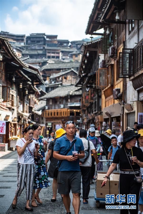 游客在贵州省雷山县西江千户苗寨景区内游玩(7月31日摄)。 新华社记者 陶亮 摄