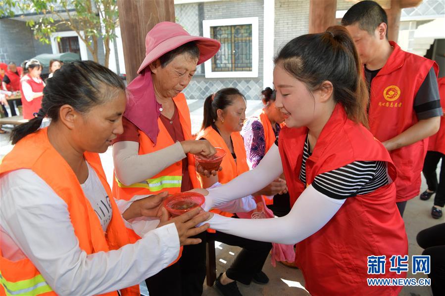 8月5日,在江西省南昌市安义县,当地同心圆志愿服务团队的志愿者为环卫工人送绿豆汤。 连日来,江西省南昌市安义县各志愿服务团队走上街头,为在城市一线工作的环卫工人免费送去西瓜、矿泉水、绿豆汤等防暑食品,并向他们提供义务剪发和义诊等服务。近年来,安义县不断推动新时代文明实践活动常态化,打通服务群众的“最后一公里”。截至目前,全县注册志愿者人数达到28604人。 新华社记者 彭昭之 摄