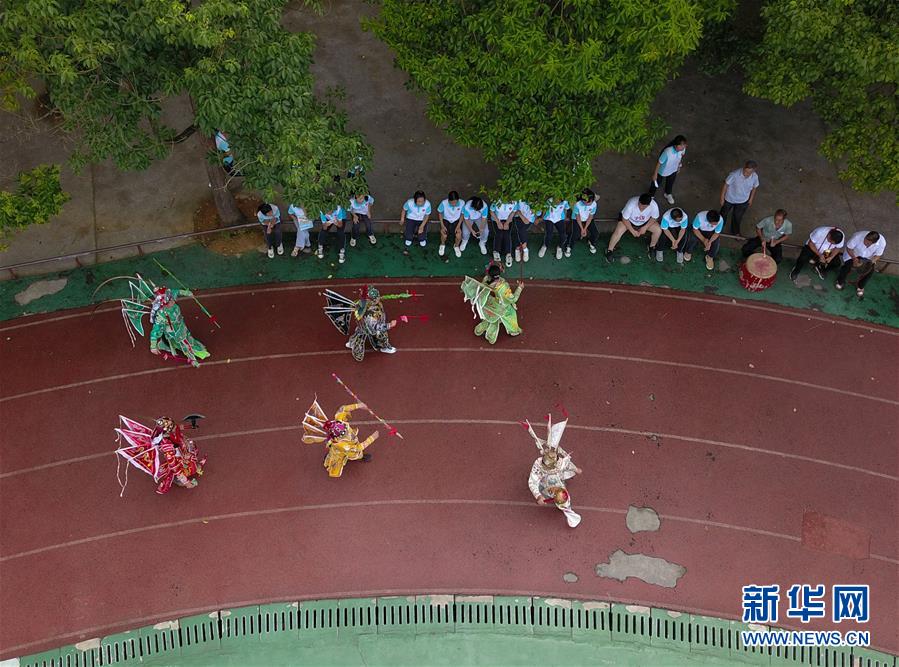 8月5日,贵州省天柱县第四中学的学生观看侗戏艺人表演(无人机照片)。 暑假期间,贵州省黔东南苗族侗族自治州天柱县第四中学组织开展“乐享侗戏度暑假”活动,聘请侗戏非遗传承人、戏班艺人对喜爱侗戏的学生进行唱腔、表演技巧等方面的指导,让孩子们感受民族传统艺术的魅力,度过一个充实又有意义的假期。 天柱侗戏是当地侗族人民在长期的劳动生活中逐渐发展形成的艺术形式,主要通过口手相传的方式,代代传承至今。2019年6月,天柱侗戏被列入贵州省第五批省级非物质文化遗产代表性项目名录。 新华社发(蔡兴文 摄)