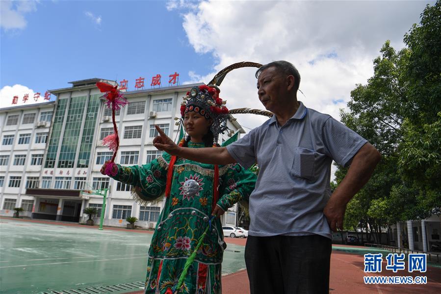 8月5日,在贵州省天柱县第四中学,侗戏艺人(右)在指导学生表演侗戏。 暑假期间,贵州省黔东南苗族侗族自治州天柱县第四中学组织开展“乐享侗戏度暑假”活动,聘请侗戏非遗传承人、戏班艺人对喜爱侗戏的学生进行唱腔、表演技巧等方面的指导,让孩子们感受民族传统艺术的魅力,度过一个充实又有意义的假期。 天柱侗戏是当地侗族人民在长期的劳动生活中逐渐发展形成的艺术形式,主要通过口手相传的方式,代代传承至今。2019年6月,天柱侗戏被列入贵州省第五批省级非物质文化遗产代表性项目名录。 新华社发(蔡兴文 摄)