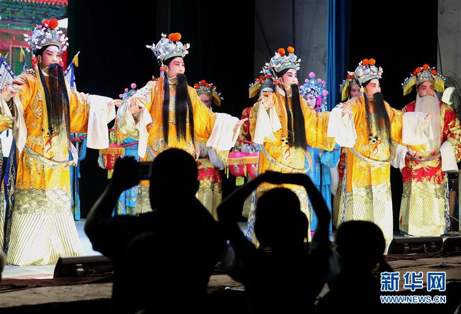 8月5日,在河北省石家庄市井陉县上安镇头泉村的村民文化广场,井陉晋剧院戏曲演员在进行晋剧联唱演出。 8月5日,河北省井陉晋剧院在石家庄市井陉县上安镇头泉村举行了2020年“暑期戏曲惠民生”首场下乡展演活动。此次惠民展演将在石家庄市西部山区农村上演60余场次,给山区群众带来《杨业归宋》、《血战金沙滩》、现代戏《李保国》等经典戏曲剧目。 近年来,河北省石家庄市井陉县通过开展国家级非物质文化遗产项目——井陉晋剧进山村、进校园、进社区等送戏惠民活动,有力促进非遗文化发展,让更多人了解传统戏曲文化。 新华社发(梁子栋 摄)