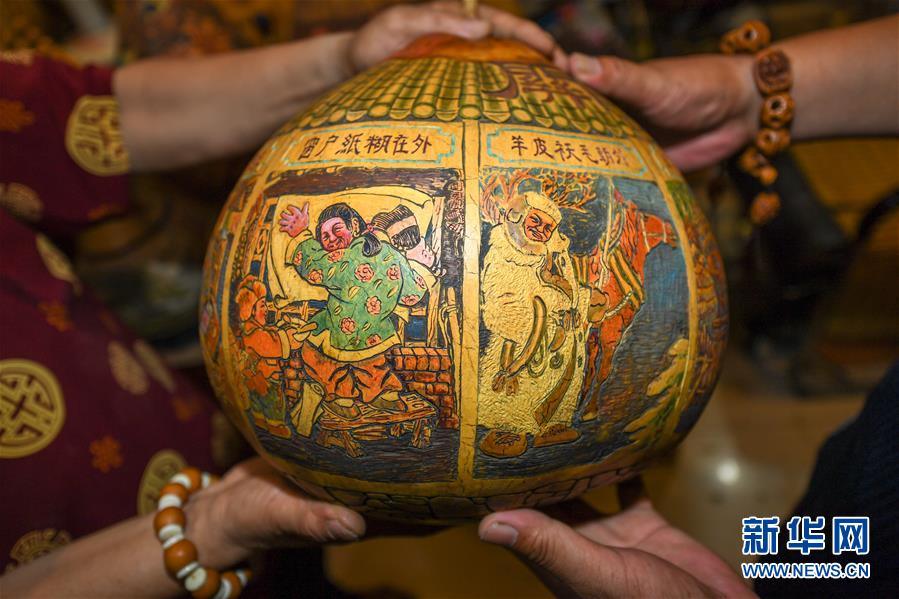 这是侯景伟创作的民俗主题葫芦工艺品(8月5日摄)。 今年55岁的吉林四平人侯景伟自幼与家人学习雕刻、烙画艺术。经过多年潜心研究,他将浮雕和烙画工艺相结合,通过抛光、起稿、雕刻、烙烫、套色等十余道工艺,制作展现传统文化、民俗故事的葫芦工艺品。2020年,侯景伟被评为四平市非物质文化遗产项目侯氏葫芦雕刻烙画代表性传承人。他说:“希望有更多人加入到非遗传承队伍中,让小葫芦‘讲’出更多民俗故事。” 新华社记者 张楠 摄