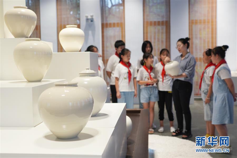 8月6日,河北省内丘县邢瓷文化体验馆工作人员向小学生介绍邢白瓷藏品。 暑假期间,河北省内丘县邢瓷文化体验馆面向中小学生免费开放,让学生们近距离了解当地邢白瓷文化、体验邢白瓷烧制技艺。 新华社记者 朱旭东 摄