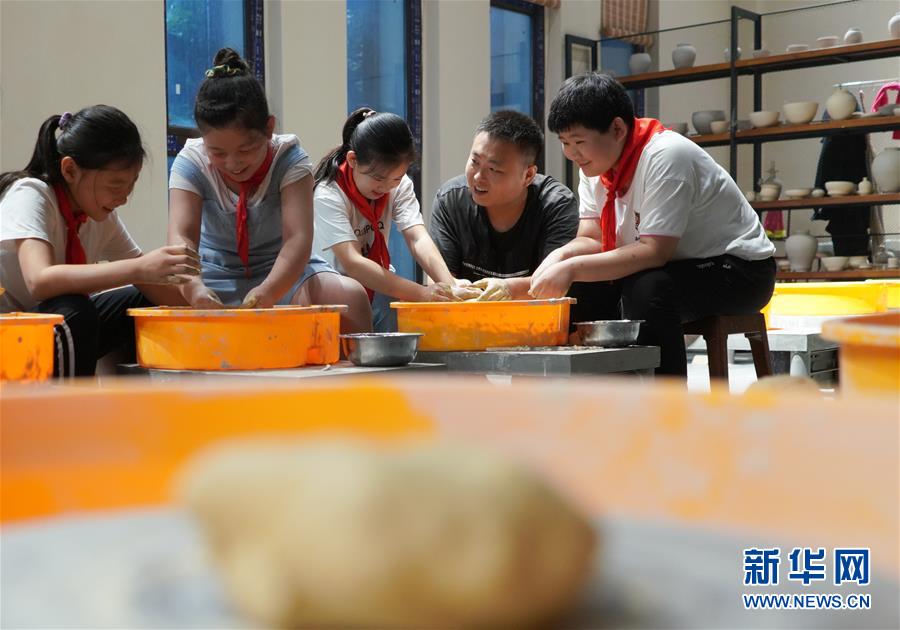 8月6日,在河北省内丘县邢瓷文化体验馆,小学生体验邢白瓷拉胚工艺。 暑假期间,河北省内丘县邢瓷文化体验馆面向中小学生免费开放,让学生们近距离了解当地邢白瓷文化、体验邢白瓷烧制技艺。 新华社记者 朱旭东 摄