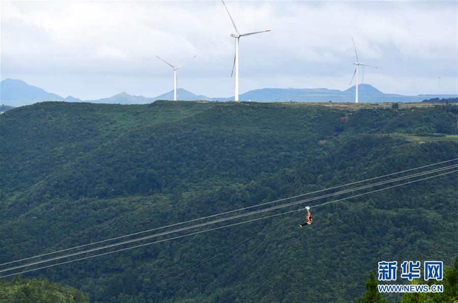 8月8日,游客在贵州省龙里油画大草原乘坐滑索观光。 近日,贵州省黔南布依族苗族自治州龙里县境内气候宜人,龙里油画大草原、“龙门镇”武侠文化主题景区等景点吸引众多游客前来观光旅游。 新华社记者 杨文斌 摄