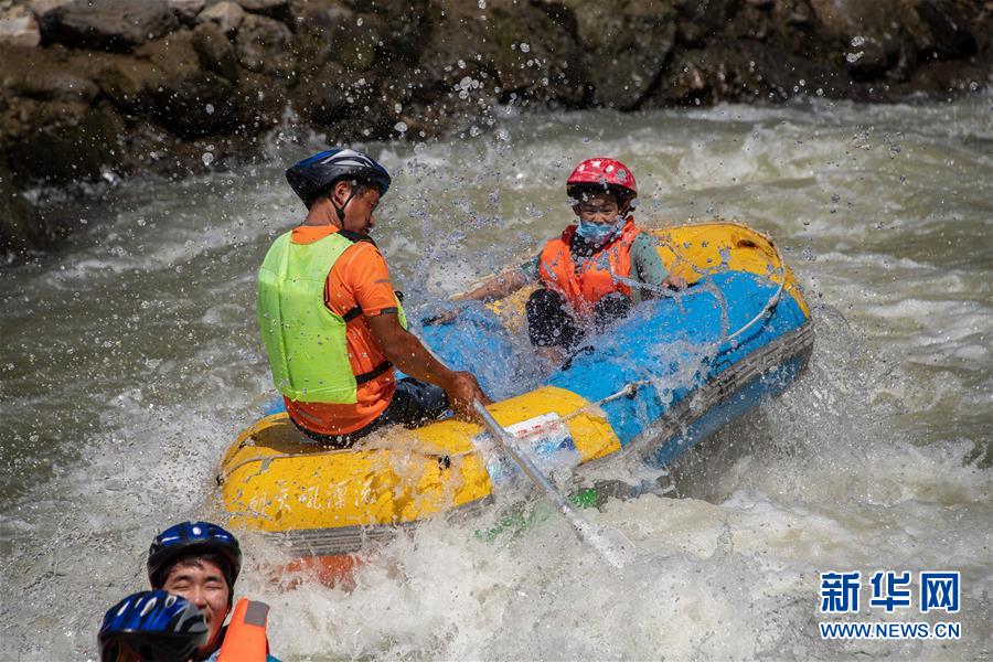 8月9日,小游客在特护员陪护下在朝天吼漂流景区漂流。 近日,湖北A级景区对全国游客免门票开放,兴山县朝天吼漂流景区的免费漂流项目吸引不少游客。景区采取错峰调配,高密度增派安全救生员等措施,保障漂流体验安全舒适。 新华社记者 杜华举 摄