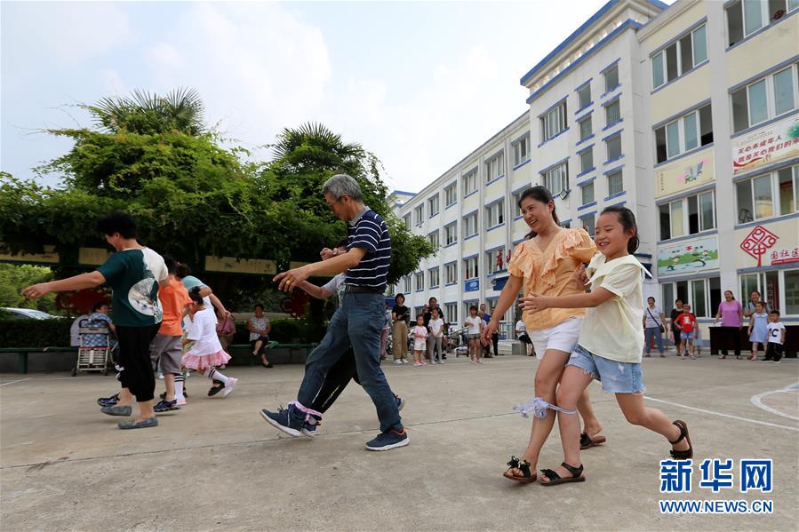 8月9日,淮北市相山区东山街道的居民和孩子参加“两人三足”趣味运动比赛。 当日,安徽省淮北市相山区东山街道在东山社区举办趣味运动会,来自辖区的孩子们在家长的陪伴下参加了“袋鼠跳”、“夹乒乓球”、“踩气球”等趣味运动项目的比赛,丰富假期生活。 新华社发(万善朝 摄)