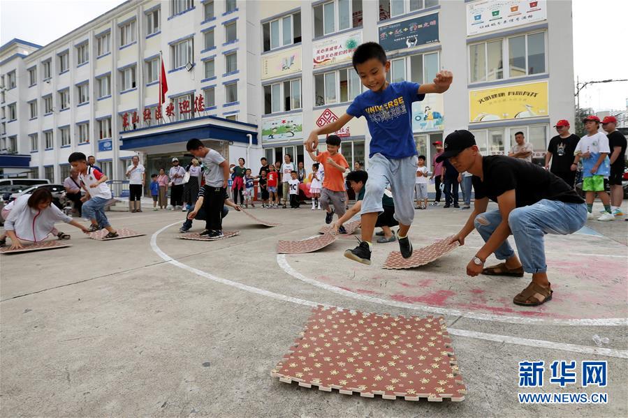 8月9日,淮北市相山区东山街道的家长和孩子参加“搭桥过河”趣味运动比赛。 当日,安徽省淮北市相山区东山街道在东山社区举办趣味运动会,来自辖区的孩子们在家长的陪伴下参加了“袋鼠跳”、“夹乒乓球”、“踩气球”等趣味运动项目的比赛,丰富假期生活。 新华社发(万善朝 摄)