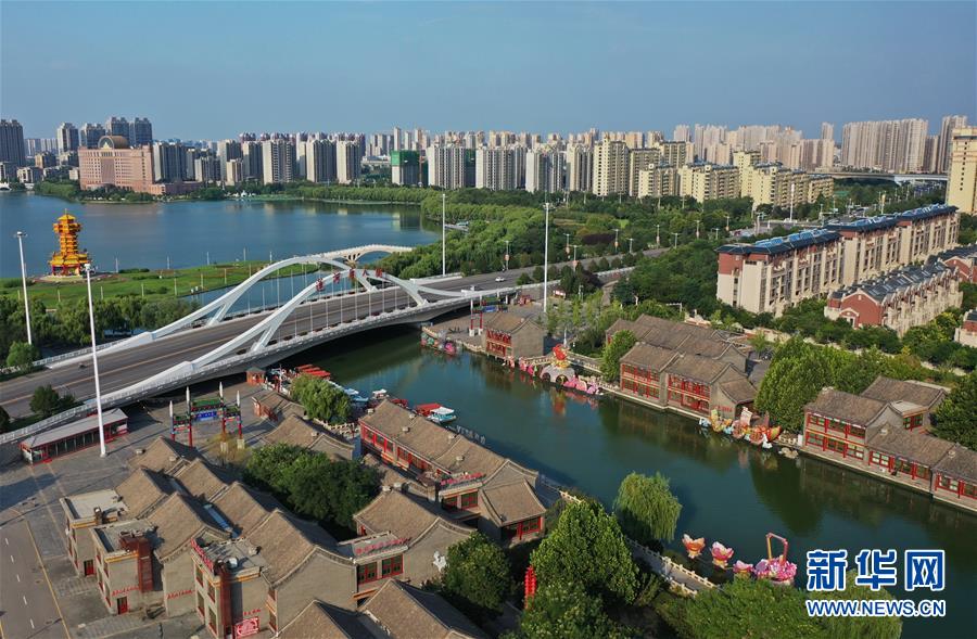 8月9日拍摄的唐山市丰南区唐津运河景色(无人机照片)。 近年来,河北省唐山市丰南区全力推动“全域治水、清水润城”工程,形成了以唐津运河、人民公园生态廊道等以健身、休闲、旅游功能于一体的人水相亲、城水相依的景观环境,为绿色发展注入活力。 新华社记者 杨世尧 摄