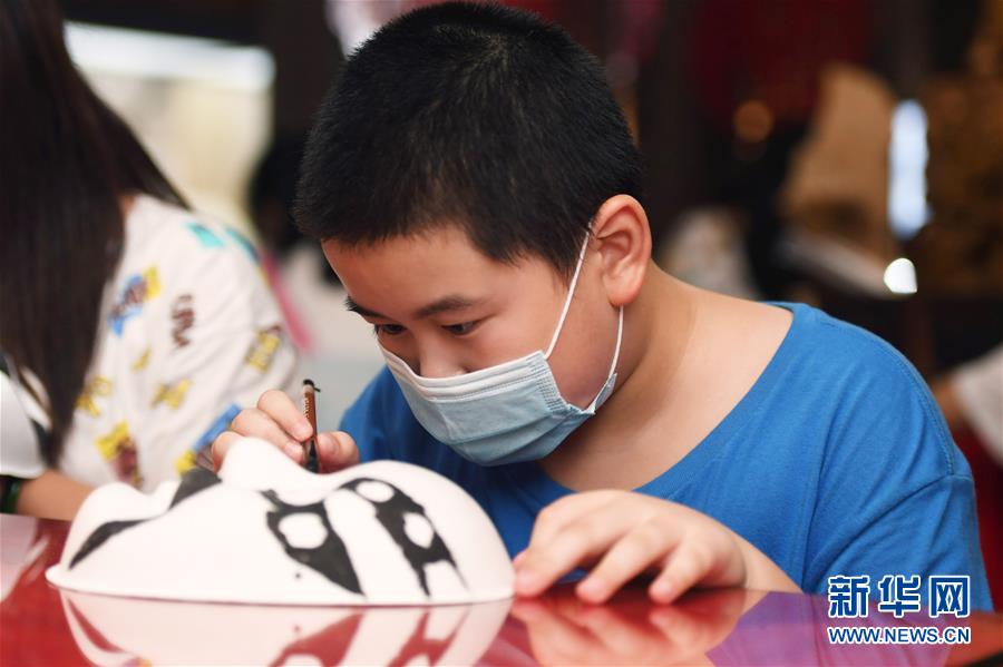 8月8日,小朋友在长沙市非物质文化遗产展示馆体验湘剧脸谱绘制。 暑假期间,许多小朋友来到位于湖南省长沙市橘子洲景区的长沙市非物质文化遗产展示馆参观体验。 新华社记者薛宇舸摄