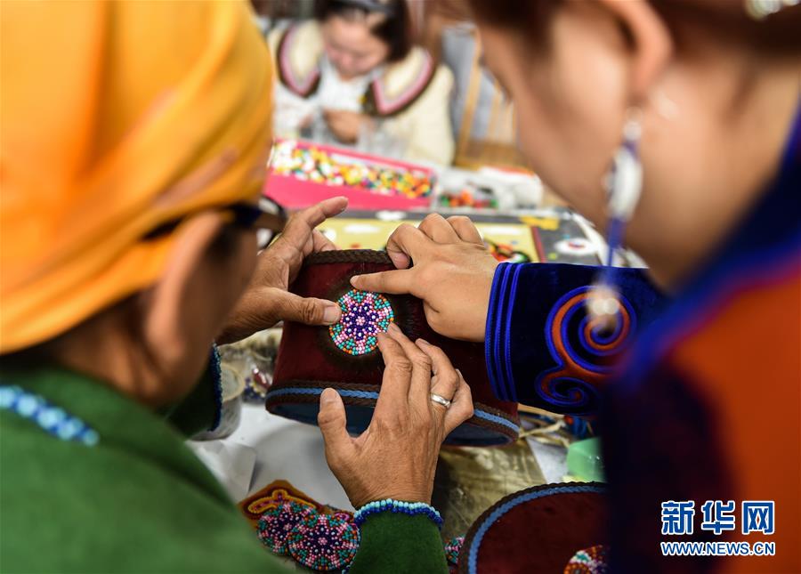 在内蒙古自治区鄂温克族自治旗巴彦托海镇太阳花传承发展中心,艾吉玛(右)和手工艺人交流制作工艺(8月6日摄)。新华社记者 刘磊 摄