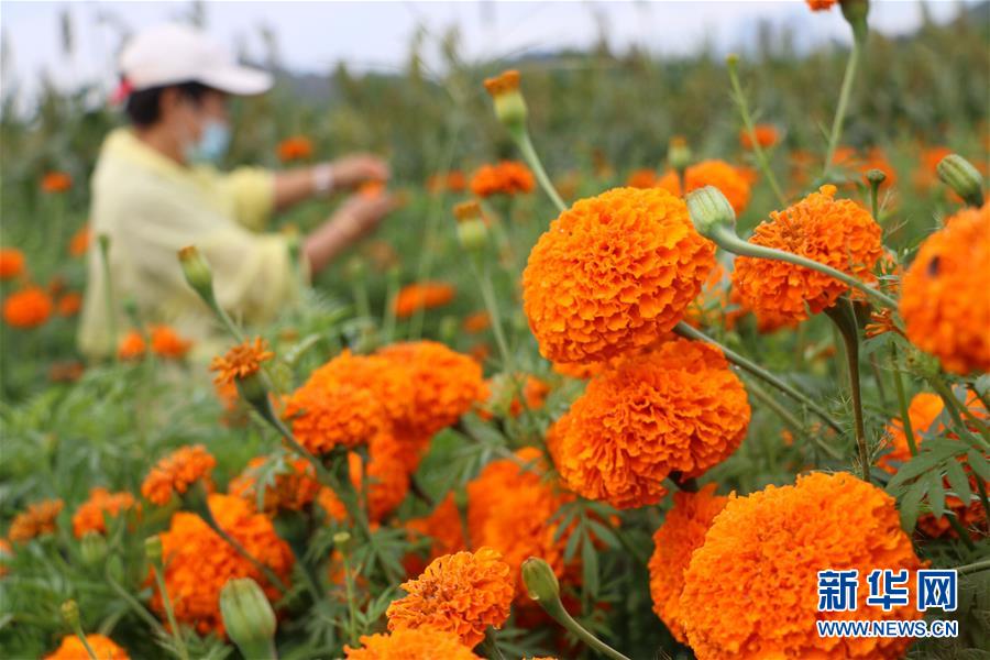 8月10日,农民在承德县六沟镇前五沟村万寿菊种植基地里采收万寿菊。 近年来,河北省承德县为推动产业精准扶贫,采取以“公司+基地+农户”的模式,发展万寿菊种植产业,带动农民增收致富。万寿菊的花朵是天然叶黄素的主要原料,目前,全县万寿菊种植面积约1.7万亩。 新华社发(刘环宇摄)