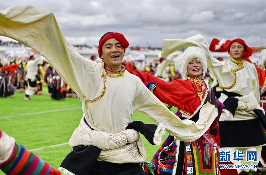 8月10日,演员在2020年那曲羌塘恰青格萨尔赛马艺术节开幕式上表演节目。 当日,2020年那曲羌塘恰青格萨尔赛马艺术节在西藏那曲市格萨尔赛马场开幕。 新华社记者 张汝锋 摄