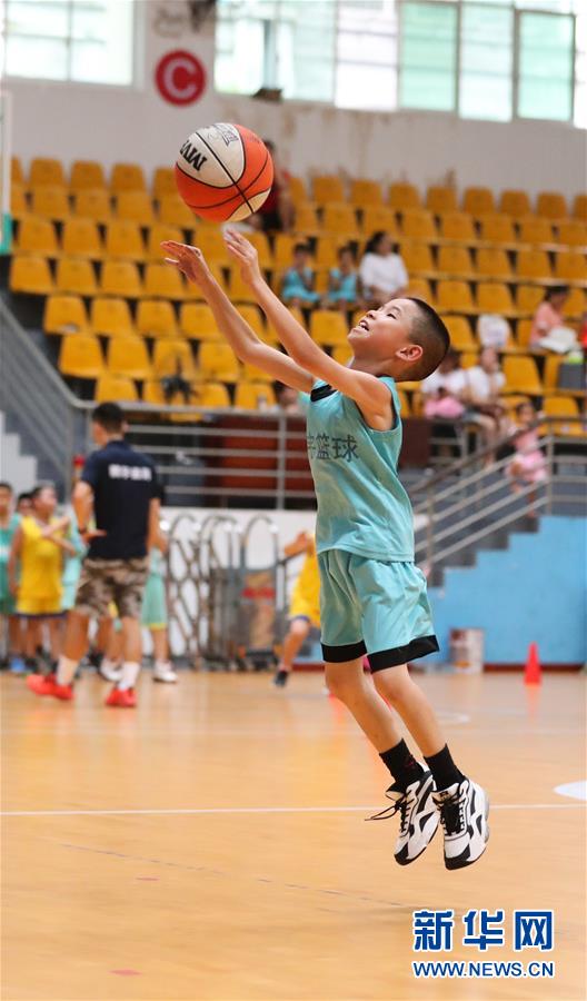 8月10日,在贵州省铜仁市玉屏侗族自治县体育馆参加篮球训练营的小球员在投篮。 暑假期间,许多学生通过参加球类运动的训练提高运动水平、强身健体,感受运动的魅力。 新华社发(胡攀学 摄)