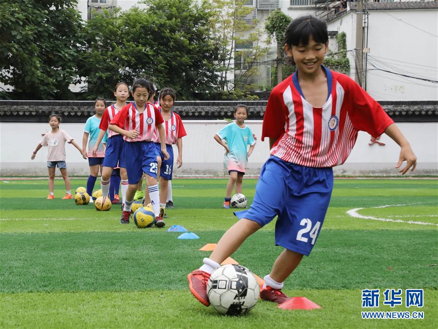 8月10日,江苏省苏州市东大街小学的女足球队员在进行训练。 暑假期间,许多学生通过参加球类运动的训练提高运动水平、强身健体,感受运动的魅力。 新华社发(杭兴微 摄)
