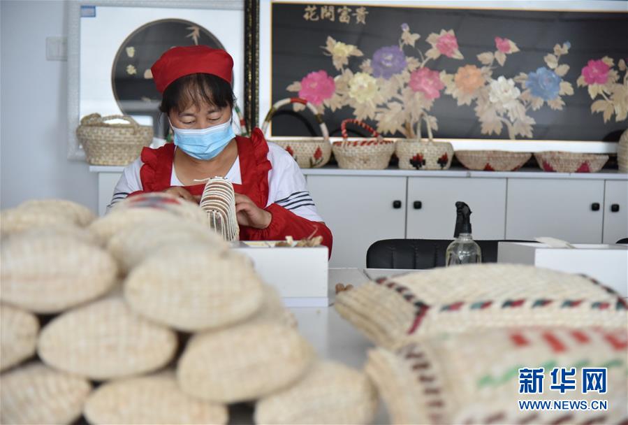 在黑龙江省齐齐哈尔市拜泉县兴国乡整理村巾帼巧娘扶贫车间,一位“巧娘”用玉米叶编织手工艺品(8月6日摄)。