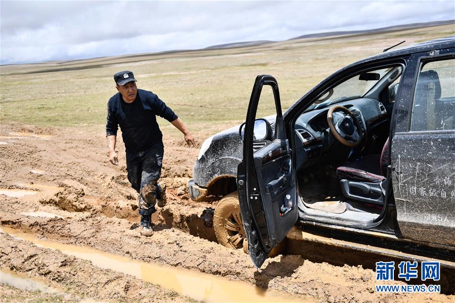 7月6日,卓乃湖保护站站长秋培扎西查看陷车情况。 新华社记者 张龙 摄
