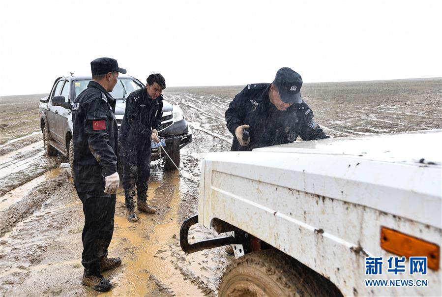 7月6日,卓乃湖保护站站长秋培扎西(右)和巡山队员更松多杰(左)、白玛东周在可可西里地区冒雨拉车。新华社记者 张龙 摄