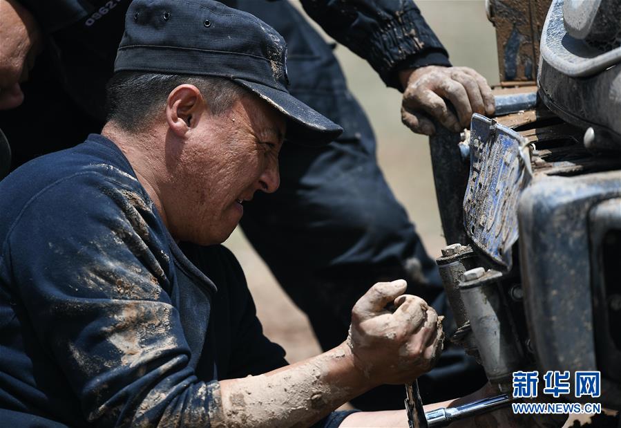 7月6日,卓乃湖保护站站长秋培扎西在可可西里地区修理车辆。 新华社记者 薛玉斌 摄