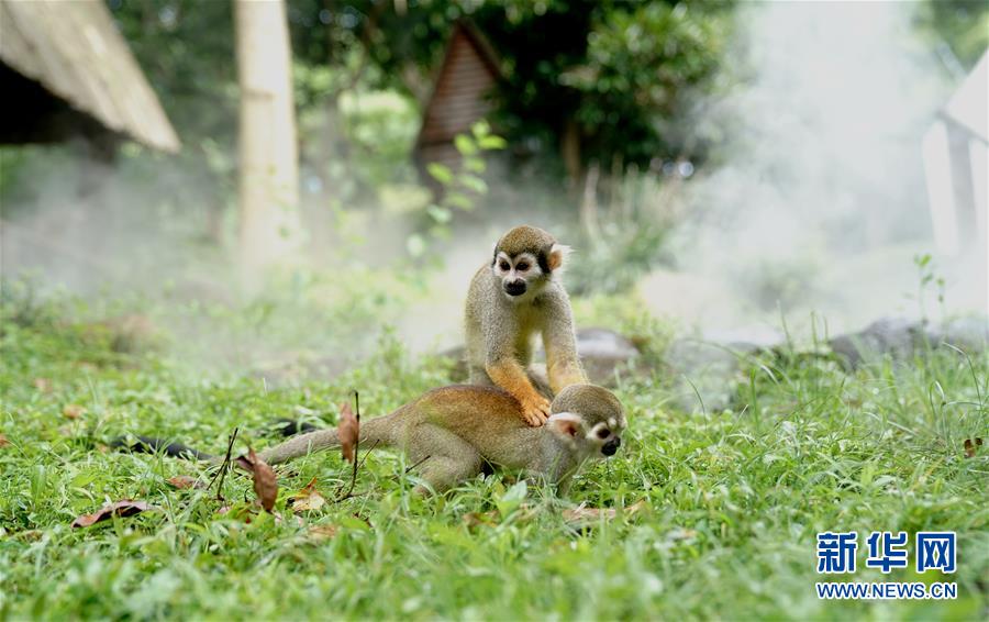 8月11日,上海动物园的松鼠猴在“地喷”营造的水雾中玩耍。 当日,上海最高温度达到35摄氏度,上海动物园开启园内安装的各种喷淋装置,让动物们防暑降温,乐享清凉。 新华社记者 张建松 摄