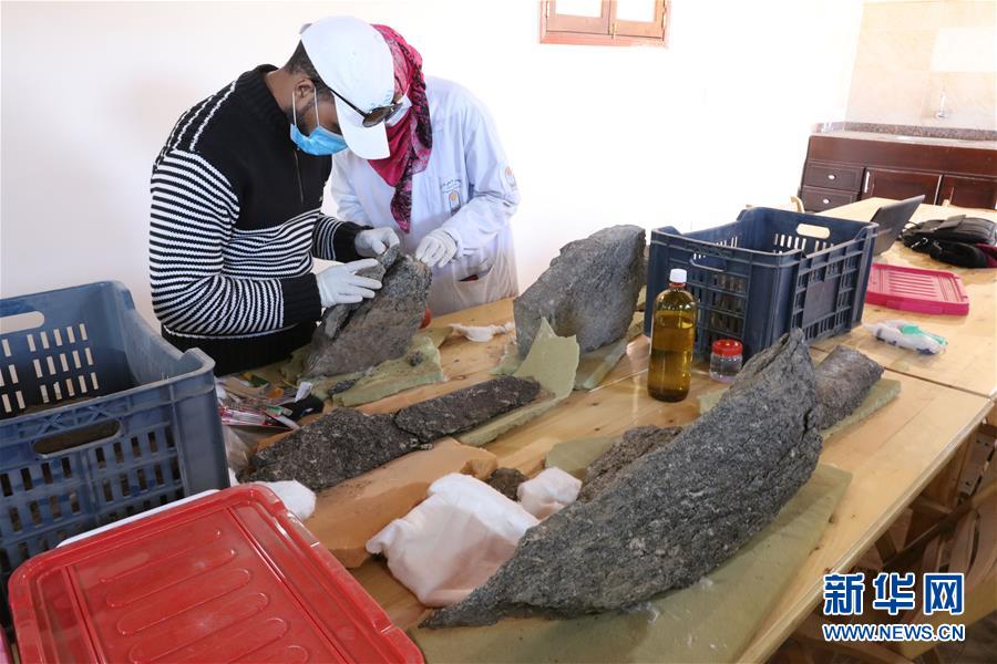 2020年3月1日,在埃及卢克索,中埃卢克索孟图神庙联合考古项目成员在实验室对雕像残块进行修复。 新华社发