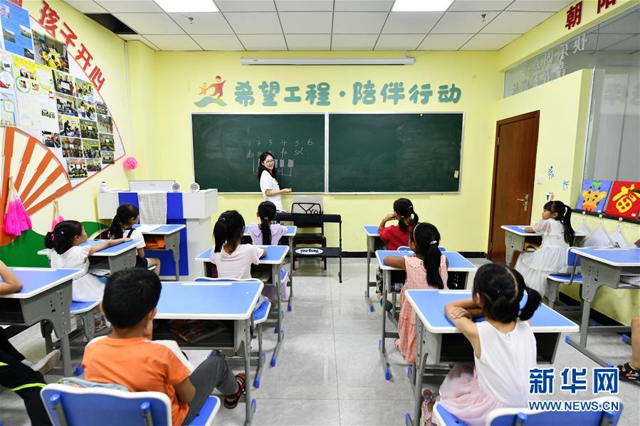 8月13日,在贵州省思南县双塘街道丽景社区易地扶贫搬迁安置点,志愿者在给孩子们上音乐课。 今年暑假期间,在贵州省铜仁市思南县双塘街道丽景社区易地扶贫搬迁安置点,来自北京有研集团和思南当地的志愿者们利用暑期时间,给安置点的孩子们进行音乐、体育、手工、安全教育等课程辅导,帮助搬迁户照看孩子,让孩子们在学习中度过一个快乐而有意义的暑假。 新华社记者 杨文斌 摄