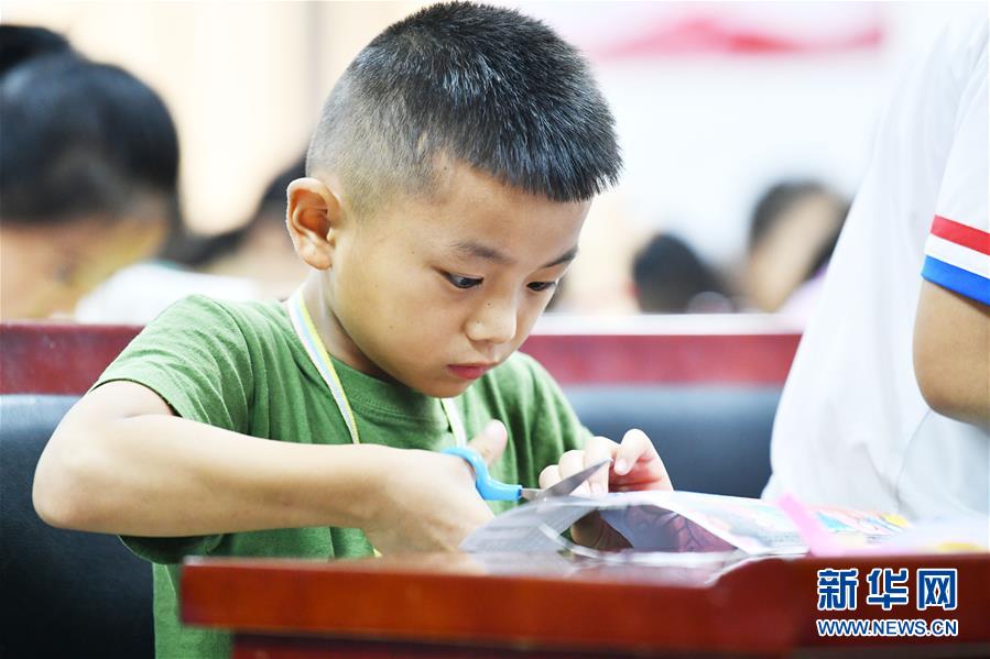 8月13日,贵州省思南县双塘街道丽景社区易地扶贫搬迁安置点的孩子在学习剪纸。 新华社记者 杨文斌 摄