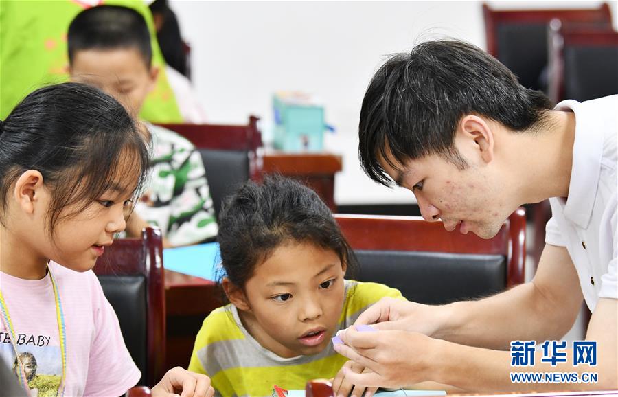 8月13日,在贵州省思南县双塘街道丽景社区易地扶贫搬迁安置点,志愿者在指导孩子们学习剪纸。新华社记者 杨文斌 摄