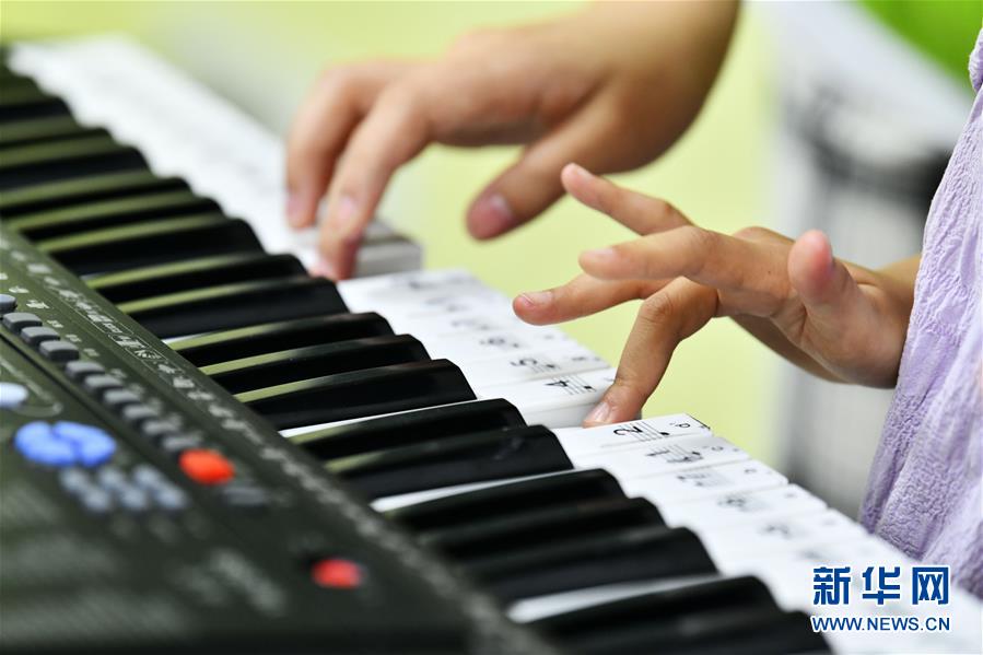 8月13日,在贵州省思南县双塘街道丽景社区易地扶贫搬迁安置点,志愿者在指导孩子学弹电子琴。 新华社记者 杨文斌 摄