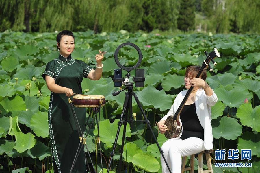 8月13日,河北省河间市西河大鼓非遗项目艺人李雪(左)、张领娣通过网络直播表演西河大鼓。 暑假期间,河北省河间市文化馆推出非遗展演“云端”播系列活动,组织当地西河大鼓非遗项目传承人利用视频直播的方式进行线上展演,通过“云端”传承非遗文化。 新华社记者 朱旭东 摄