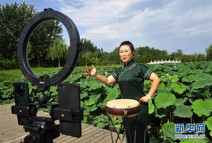 8月13日,河北省河间市西河大鼓非遗项目艺人李雪通过网络直播表演西河大鼓。 暑假期间,河北省河间市文化馆推出非遗展演“云端”播系列活动,组织当地西河大鼓非遗项目传承人利用视频直播的方式进行线上展演,通过“云端”传承非遗文化。 新华社记者 朱旭东 摄