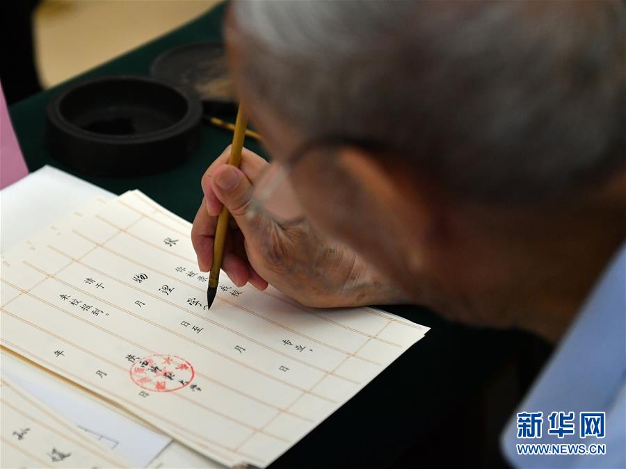 8月13日,陕西师范大学退休教师符有堂书写录取通知书。 当日,陕西师范大学2020年手写录取通知书正式开笔。该校自2007年起采用毛笔书写录取通知书的方式,为新生传递佳音。今年,学校十余位退休教师、在职教师、校友代表等书法爱好者将为约4500名新录取的本科生送上带着墨香的大学录取通知书。 新华社记者 张博文 摄