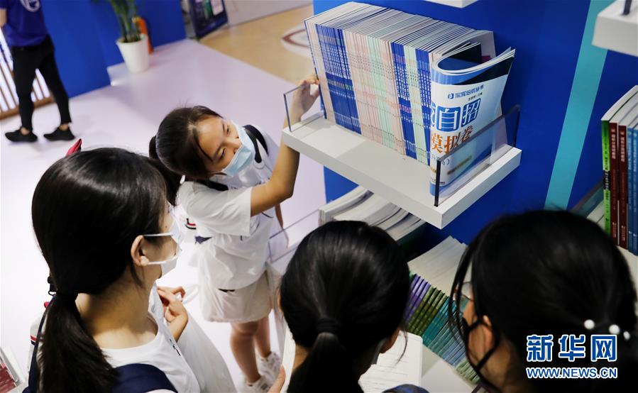 8月13日,几名中学生在书展上的一个教辅书架前驻足观看。 8月12日,2020上海书展在上海展览中心开幕。全国各大出版社汇聚书展现场,不同年龄层的读者都能徜徉其中,感受书香魅力。 新华社记者 方喆 摄