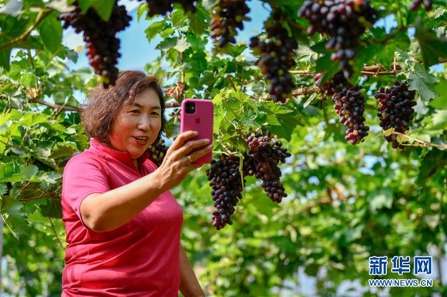 天津市宝坻区民盛种养殖专业合作社理事长张秀霞在葡萄大棚内录制葡萄丰收视频(8月13日摄)。 近日,天津市宝坻区民盛种养殖专业合作社里的葡萄丰收,进入采摘季。新冠肺炎疫情期间,合作社利用网络渠道积极开展互联网无接触配送业务,业务辐射京津冀地区以及广东、海南等地。 新华社发 (孙凡越 摄)