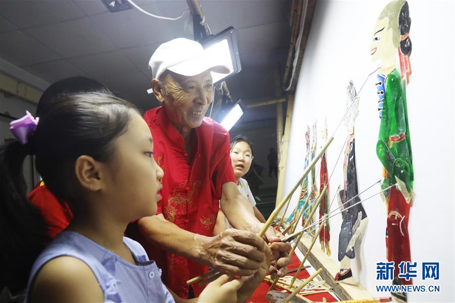 8月14日,皮影戏艺人在河北省唐山市丰润区文化馆指导小朋友表演皮影戏。 暑假期间,各地的孩子们通过丰富多彩的活动乐享假期、充实生活。 新华社发(朱大勇 摄)