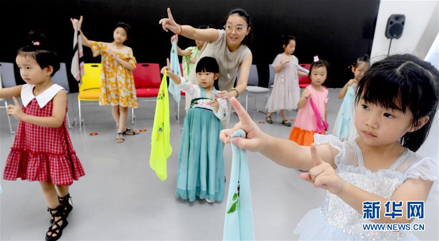8月14日,在浙江省台州市路桥区路桥街道人峰社区文化礼堂,孩子们在学习越剧手势动作。 暑假期间,各地的孩子们通过丰富多彩的活动乐享假期、充实生活。 新华社发(王保初 摄)