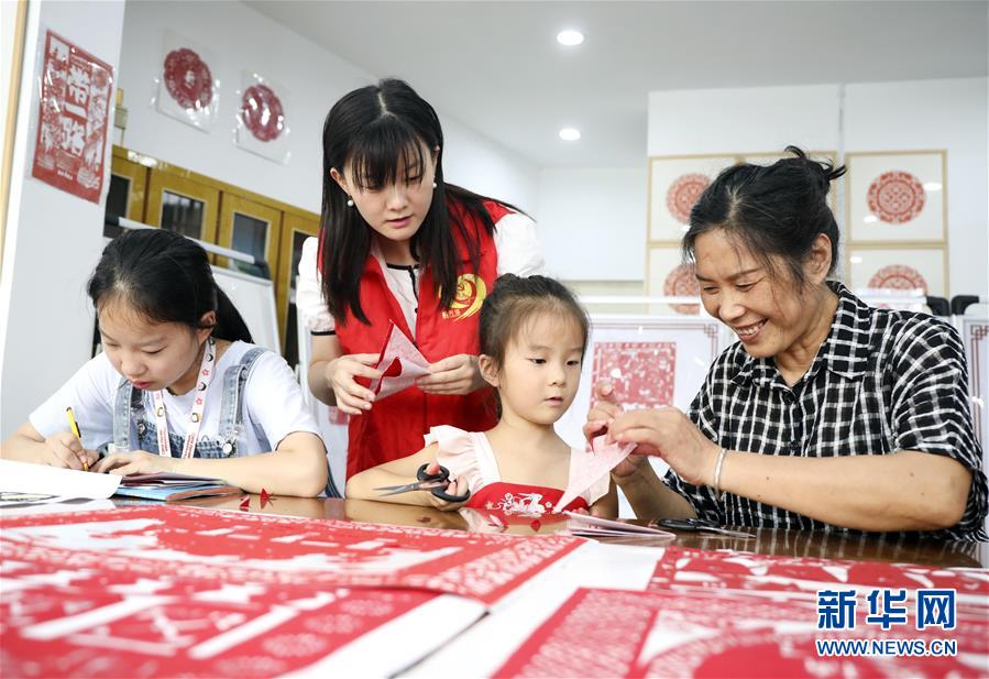 8月14日,在杭州市桐庐县桐君街道圆通社区,来自桐庐君山红剪纸社的志愿者在指导孩子们剪纸。 暑假期间,各地的孩子们通过丰富多彩的活动乐享假期、充实生活。 新华社发(徐军勇 摄)