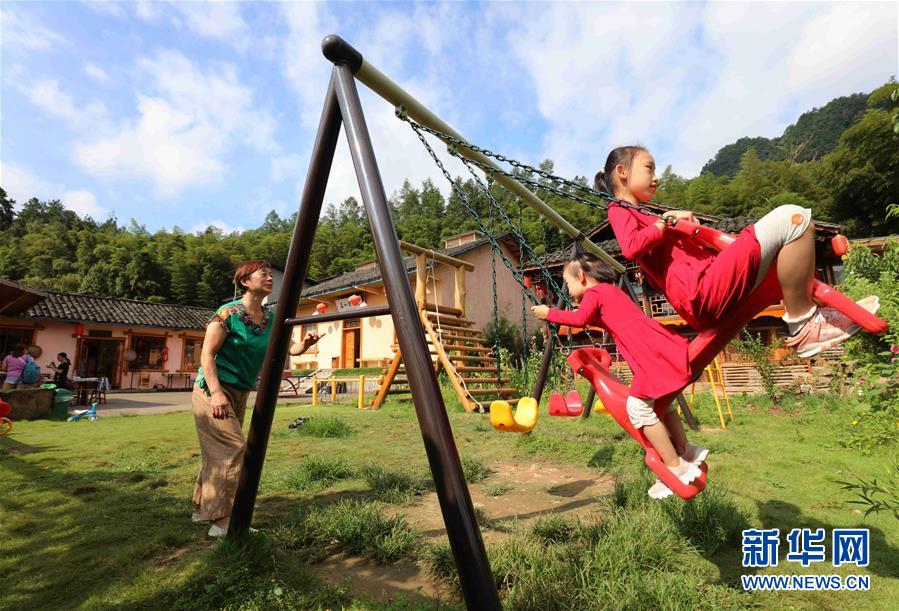8月13日,在张家界市武陵源区镜立方山居度假民宿,几名小朋友在家长的陪伴下玩耍。 近年来,湖南省张家界市武陵源区依托旅游资源优势,通过农民入股经营、农村闲置住宅改造等措施在景区周边农村发展民宿经济。设计新颖的特色民宿加上得天独厚的自然风光、凉爽的高山气候,吸引各地游客前来休闲度假。 据了解,目前武陵源区已有乡村特色民宿300余家,年接待中外游客逾300万人次,民宿不仅成为乡村经济增长的新亮点,还带动当地村民在家门口实现就业增收。 新华社发(吴勇兵 摄)