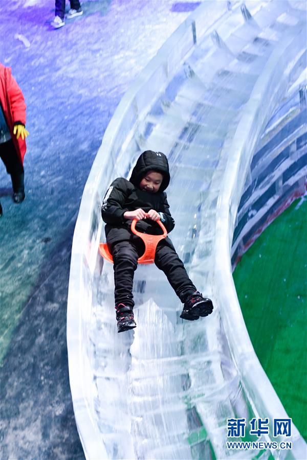 8月16日,小朋友在梅山湾冰雪大世界主题乐园里体验冰上过山车。 近日,浙江遭遇连续高温天气,不少游客来到宁波市北仑区梅山湾冰雪大世界主题乐园休闲避暑。 新华社记者 黄宗治 摄