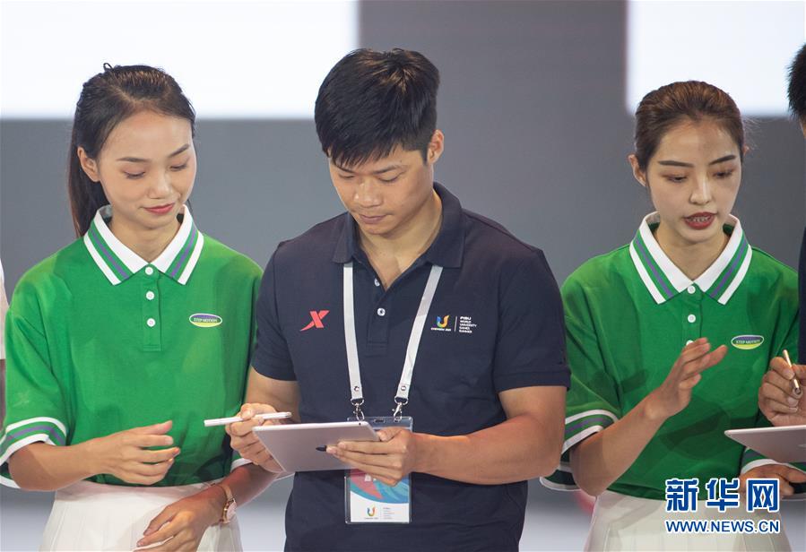 8月18日,中国男子短跑运动员苏炳添(中)等代表共同签发电子邀请函,向全球盛情邀约。 当日,成都大运会组委会在成都市广播电视台演播大厅举行第31届世界大学生夏季运动会倒计时一周年活动。 新华社记者 江宏景 摄