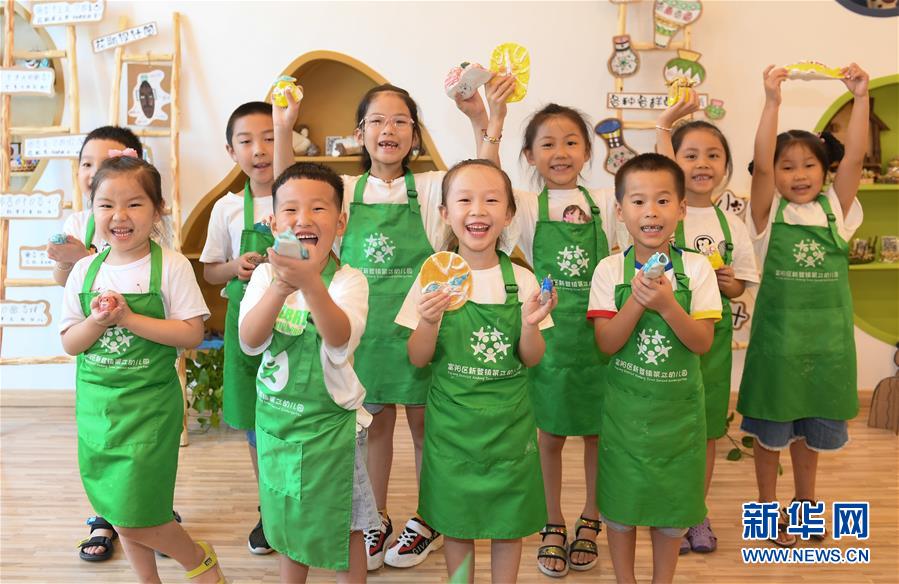 8月19日,小朋友展示自己的作品。 当日,浙江杭州富阳区新登镇第二幼儿园大山园区开展“五彩陶艺”暑期活动,幼师、党员志愿者指导小朋友进行陶艺创作。该校自2015年起开始将陶艺作为特色课程,锻炼学生的动手能力。 新华社记者翁忻旸摄