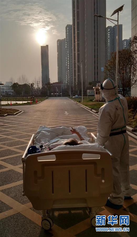 3月5日傍晚,在武汉大学人民医院东院,复旦大学附属中山医院支援湖北医疗队的刘凯在护送患者做CT的途中停下,让住院近一个月的87岁老人欣赏久违的日落。新华社发(甘俊超 摄)