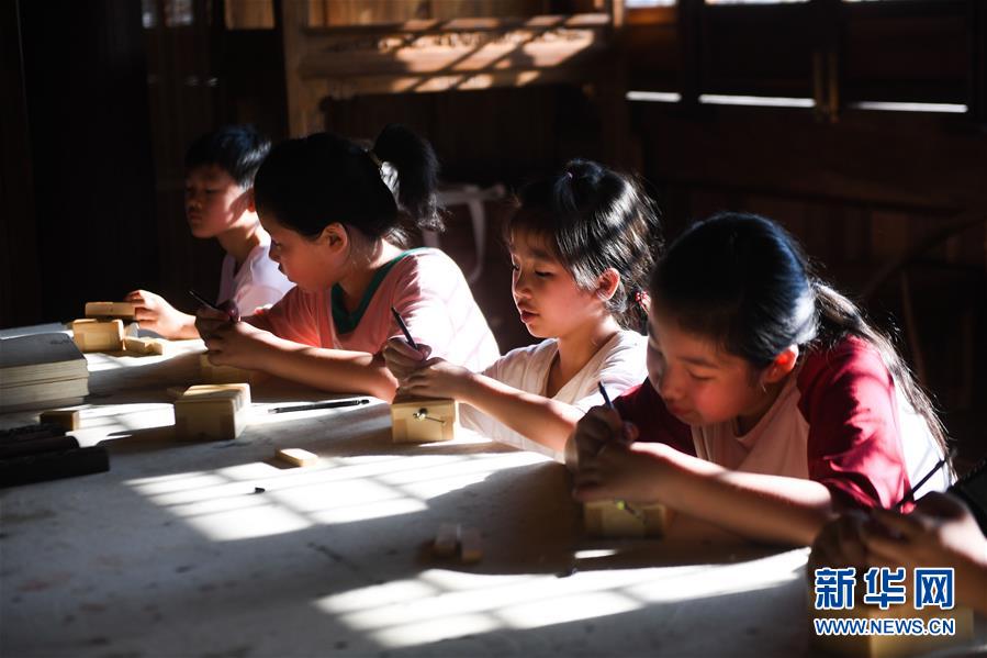 8月19日,在环山乡诸佳坞村文化礼堂里,孩子们在志愿者的指导下体验篆刻艺术。 今年暑期,浙江省杭州市富阳区环山乡的党员志愿者和巾帼志愿者,依托多个新近改造完成的村级文化礼堂办起暑期“爱心托管班”,为孩子们辅导暑期作业,同时还开展篆刻、音乐、游泳等兴趣活动,解决村民的后顾之忧。 新华社记者 徐昱 摄